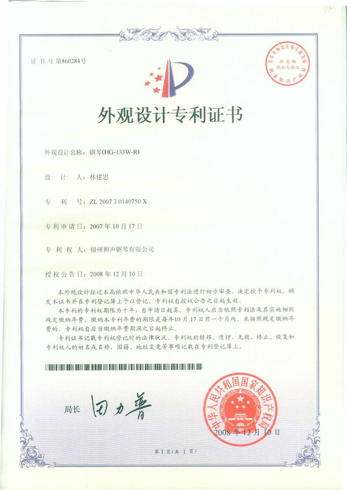 钢琴(HG-133W-R型)(外观设计专利,专利号:ZL 2007 3 0140750.X) 2018-06-28 09:24:42