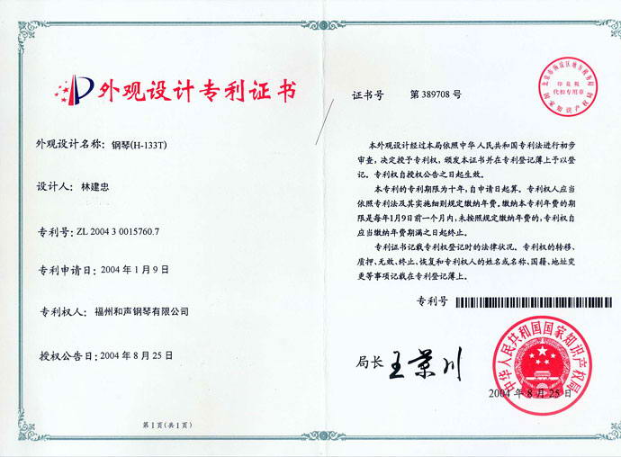 钢琴(H-133T型)(外观设计专利,专利号:ZL 2004 3 0015760.7) 2018-06-28 09:26:14