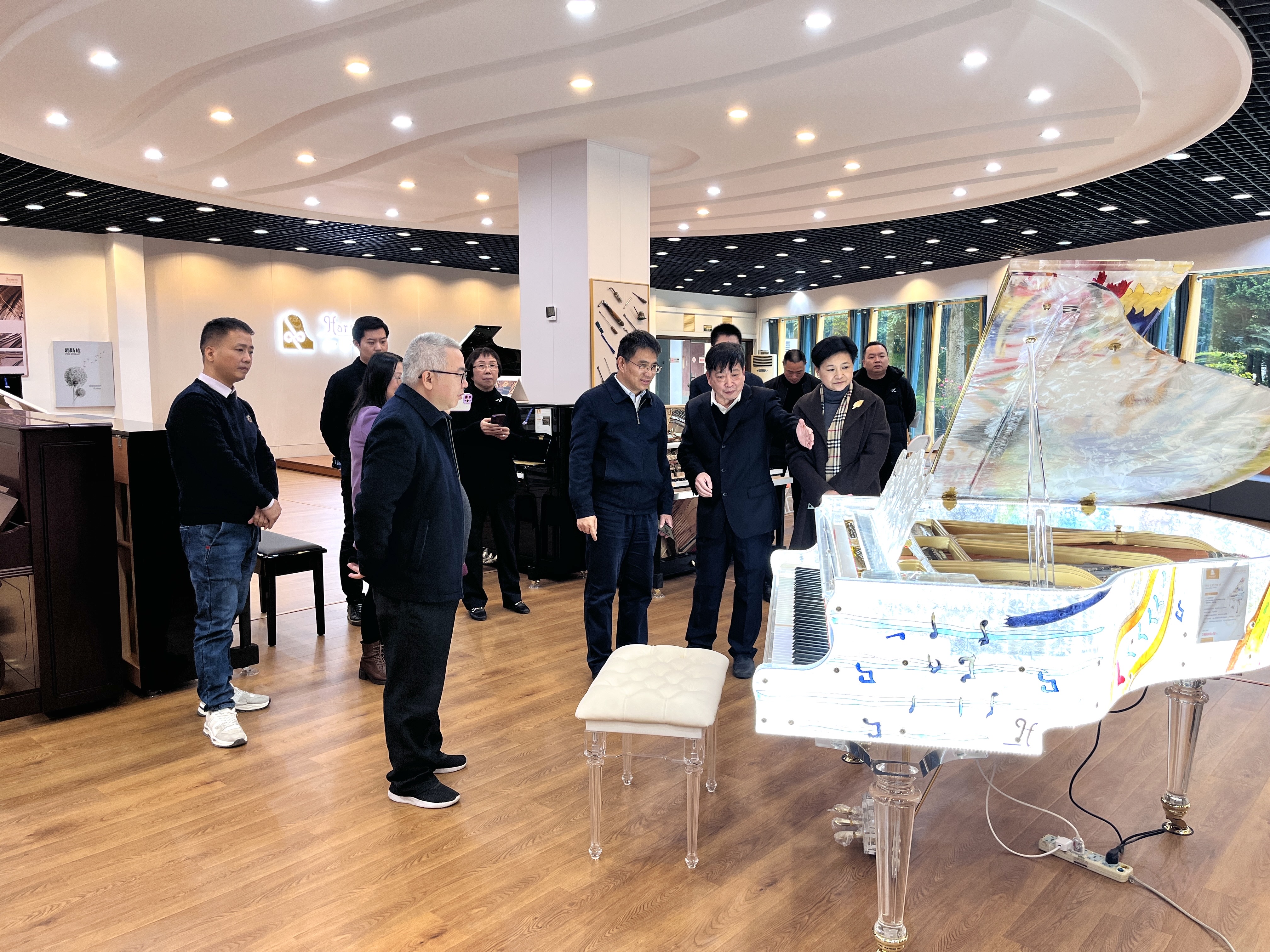 随后,考察组一行实地考察了恒温恒湿生产车间和钢琴展厅,深入了解和声钢琴生产工序、技术工艺、产品品质等情况,对公司的厂容厂貌、品质管控、新品研发等给予赞赏和充分肯定,同时希望和声钢琴公司能够发挥自身优势,主动融入福建文旅经济发展,打造独具特色的本土钢琴文化传播体系。当天,考察组向公司选购10台钢琴用于民盟“烛光行动”捐赠龙岩漳平市城北小学。