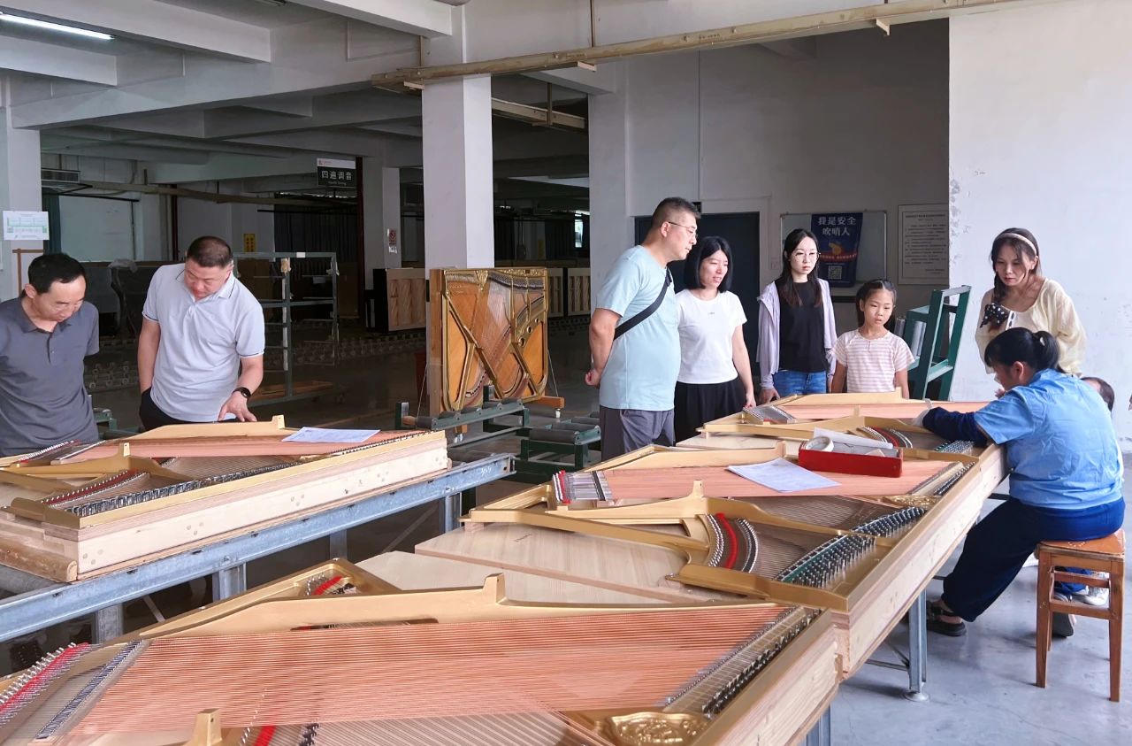 在李建国总经理的带领下,琴童及老师们跟随和声钢琴公司的专业引导,逐一探访了音板静置养生房、精密控制的恒温恒湿钢琴生产车间,以及集展示与体验于一体的多功能钢琴展示厅。从钢琴零部件的精雕细琢到成品钢琴的华丽诞生,每一步都见证了智能化、专业化与规模化管理的卓越成就。钢琴展厅内,各种型号的哈曼尼钢琴犹如璀璨星辰,无论是古典的韵味还是现代的创新,都透露出品牌对工艺与品质的极致追求,让在场的每一个人都为之动容。